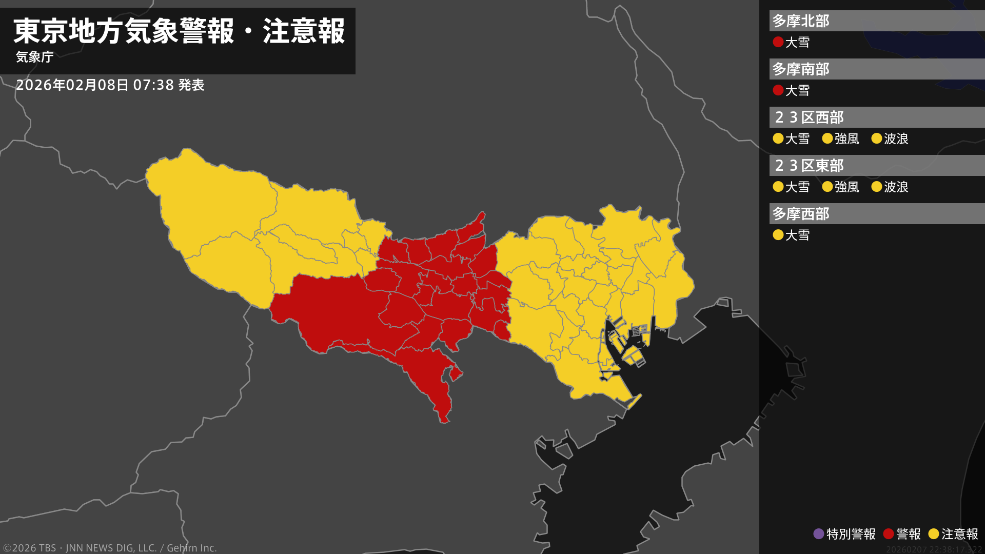 【大雪警報】東京都・八王子市、立川市、武蔵野市、三鷹市、府中市、昭島市などに発表 8日07:38時点