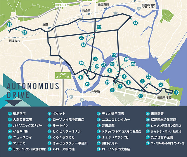 自動運転タクシーの運行エリアは、きんときタクシーの走行実績が多い鳴門市西部から徳島阿波おどり空港まで。