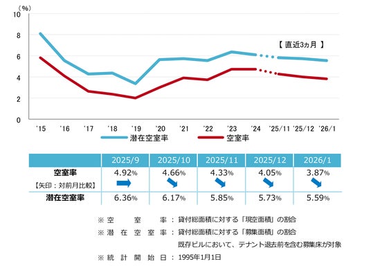 空室率は前月比マイナス0.18ポイントの3.87%と4ヵ月連続で低下し、2023年1月以来の3%台となった。新築ビルを中心に空室消化が進み、主な低下要因となっている。エリア別では「天神」が前月比マイナス1.1ポイントと大幅に低下した。潜在空室率は前月比マイナス0.14ポイントの5.59%だった。