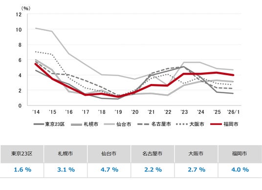 三幸エステート株式会社(本社:東京都中央区、取締役社長:福島正二郎)は、2026年1月度の福岡市オフィス賃貸状況(空室率&現空面積:全規模、募集賃料&募集面積:全規模、規模別空室率、主要エリア※1空室率:全規模)および全国6大都市(東京・札幌・仙台・名古屋・大阪・福岡)の大規模ビルのマーケットデータをまとめた「オフィスマーケット2026年2月号福岡」を公表します。