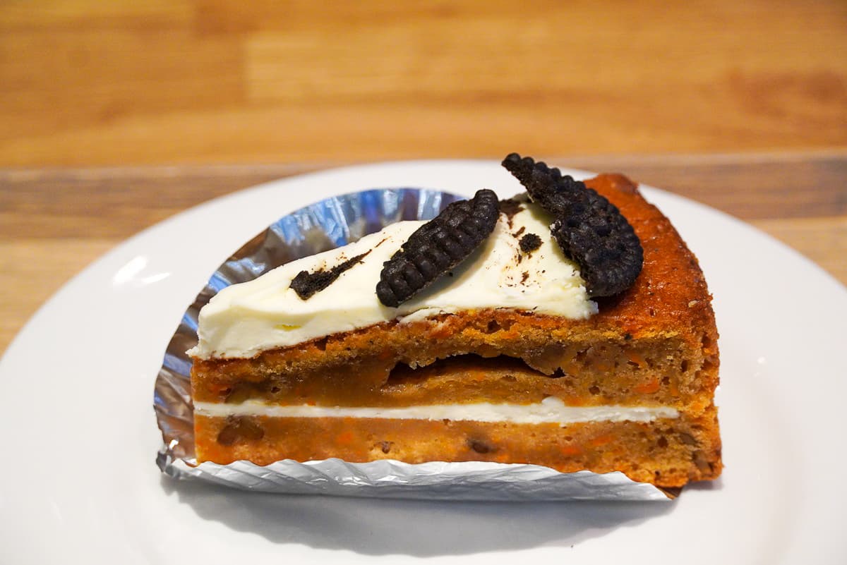「キャロットケーキ」は、夏みかんをブレンドしたマーマレードをキャロット生地に練り込み、クルミやリンゴも加えた、食感豊かな一品。しっとりしながらも重すぎず、後味はすっきり。さっぱりとした甘さで、コーヒーのおともにぴったりです。ちょこんとのったオレオもアクセントになっています。
