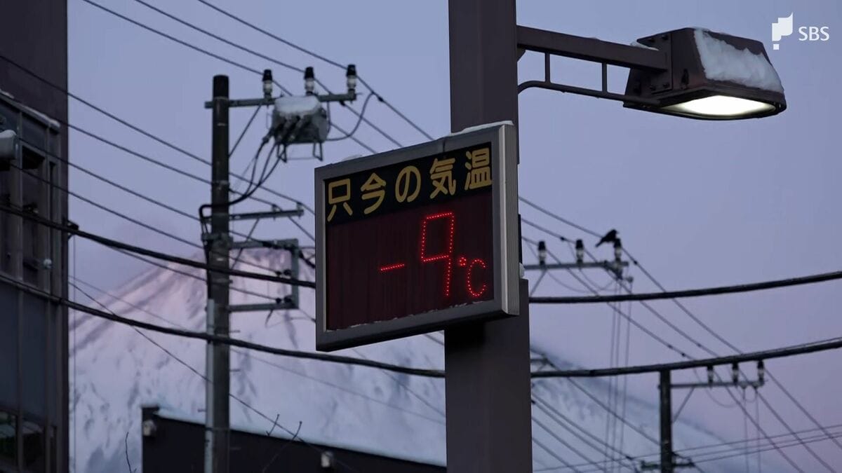 「まだ雪が残るJR御殿場駅前です。非常に冷え込んでいて、駅前の温度計はマイナス9℃」