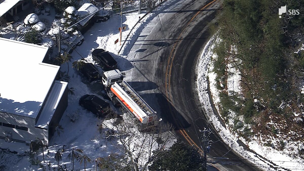 大雪から一夜明けた午前の伊東市。国道135号では多くの車が動けないままになっていました。