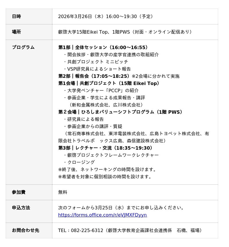 【参加者募集】3月26日(水) 共創プロジェクト・ひろしまバリューシフトプログラム最終報告会 – 【公式サイト】広島県公立大学法人 叡啓大学