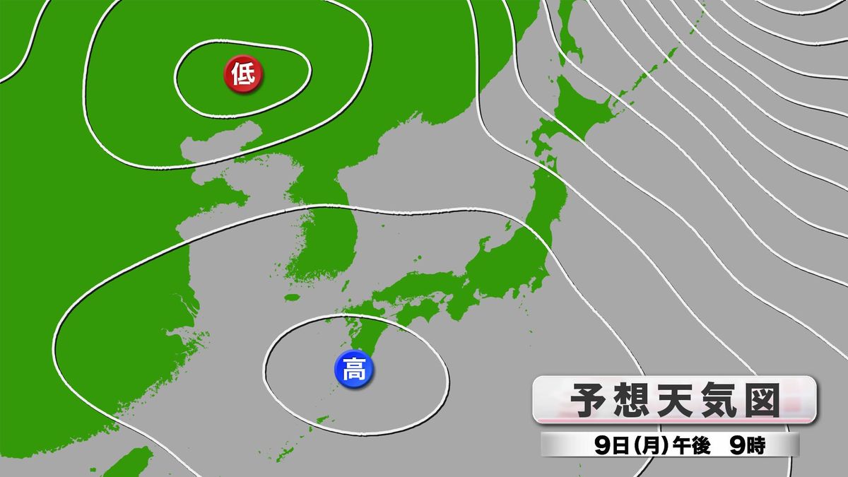 きょう9日(月)は午後になるほど、県内は高気圧にしっかりと覆われる予想で、きのう8日(日)の雪の原因となった冬型の気圧配置は解消へ向かう見通しです。