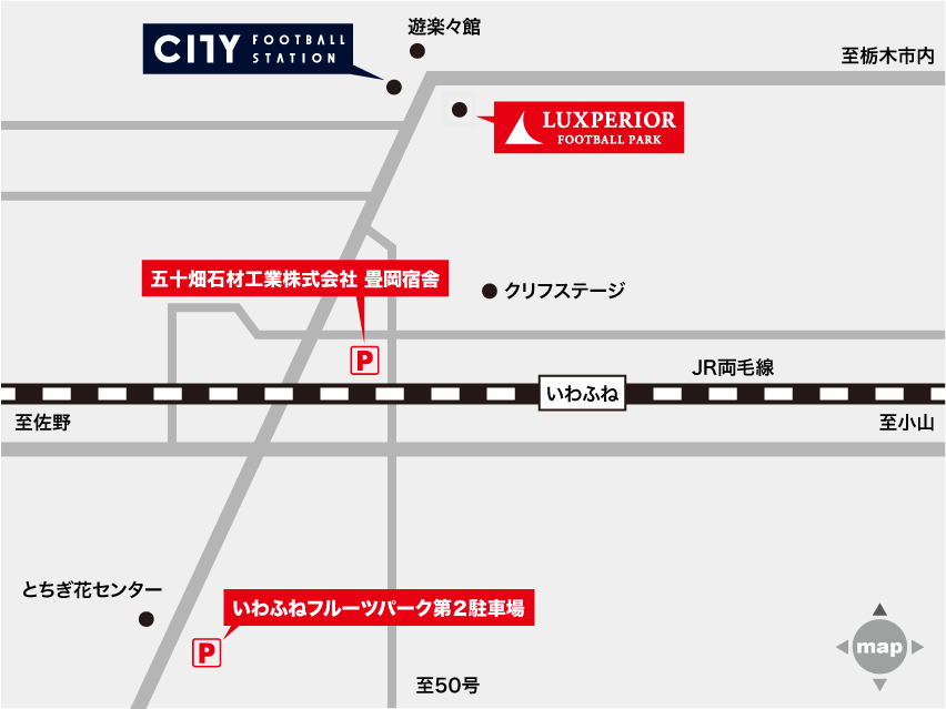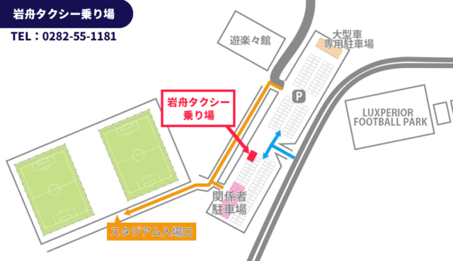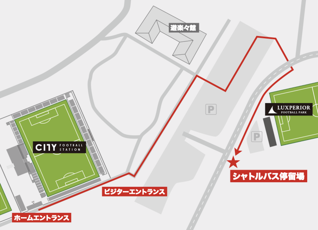 ※LUXPERIOR FOOTBALL PARK駐車場から遊楽々館の駐車場まで車道を歩いての通行は大変危険ですので、上記の地図の道を通りCFSの方へお越しください。