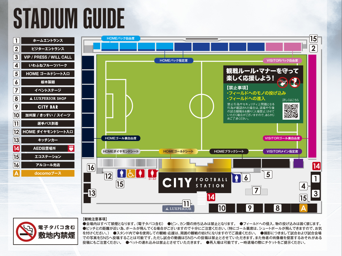 ・CITY FOOTBALL STATIONは、ピッチと観客席の距離が近いため、飛んでくるボールにはご注意ください。なお、ピッチ内アップ終了後までゴール裏に防球ネットを設置しております。ピッチ内アップ後、防球ネットは撤収いたします。