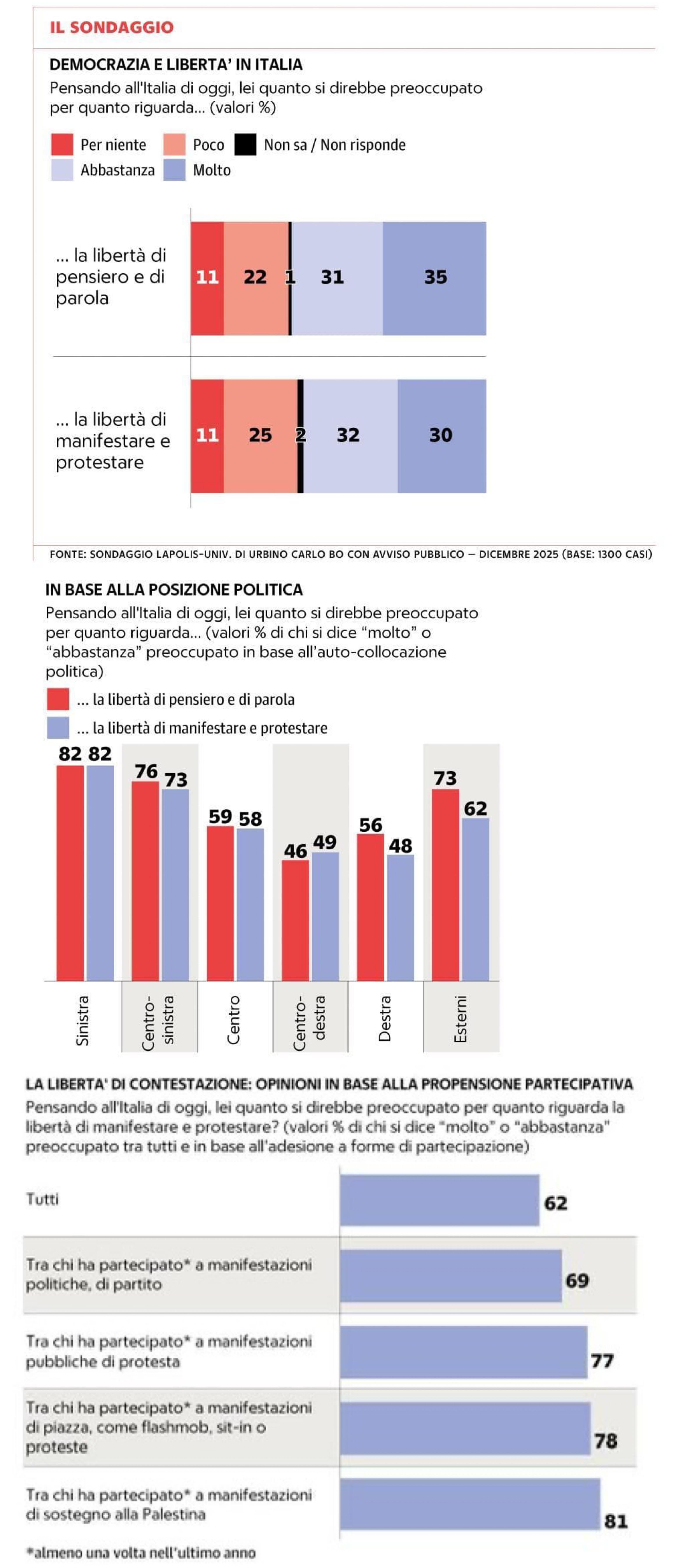 研究で明らかになったのは、 インタビューを受けたイタリア人の3人に2人は「デモの自由」や「抗議活動」について不安を感じている。 憲法第 1 編によって保証されています。しかし、危機認識は政治理念によって異なる。実際、データは、次のような人々の不安の程度がどのようにより高いレベルに達しているかを明らかにしています。 彼らは左側にいます、約80%。選挙区に移ると割合は大幅に下がる 中道派と右派がいますが、依然として約50%です。 一方、伝統的な政治的分断に対して「外部」であると主張する人々に関しては、その数字は「言論の自由」に関しては最大73%、「デモの自由」に関しては最大62%に再び上昇している。