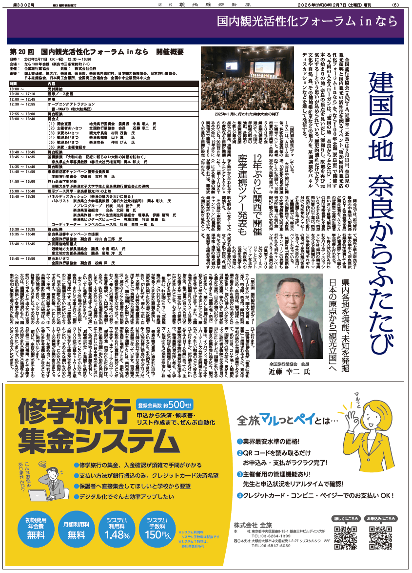 全国旅行業協会(ANTA、近藤幸二会長)は2月11日、奈良県の観光振興と国内観光の活性化を図るイベント「第20回国内観光活性化フォーラムinなら」を、なら100年会館(奈良市)で開催する。今回の大会スローガンは、「建国の地 奈良からふたたび」。“日本の始まりの地”奈良の原点を見いだし、深掘りし、故郷を再び元気にする―という思いが込められている。歴史的遺産だけでなく、文化や自然、食、その他地場産業などの魅力を、基調講演やパネルディスカッションなどを通して発信する。
