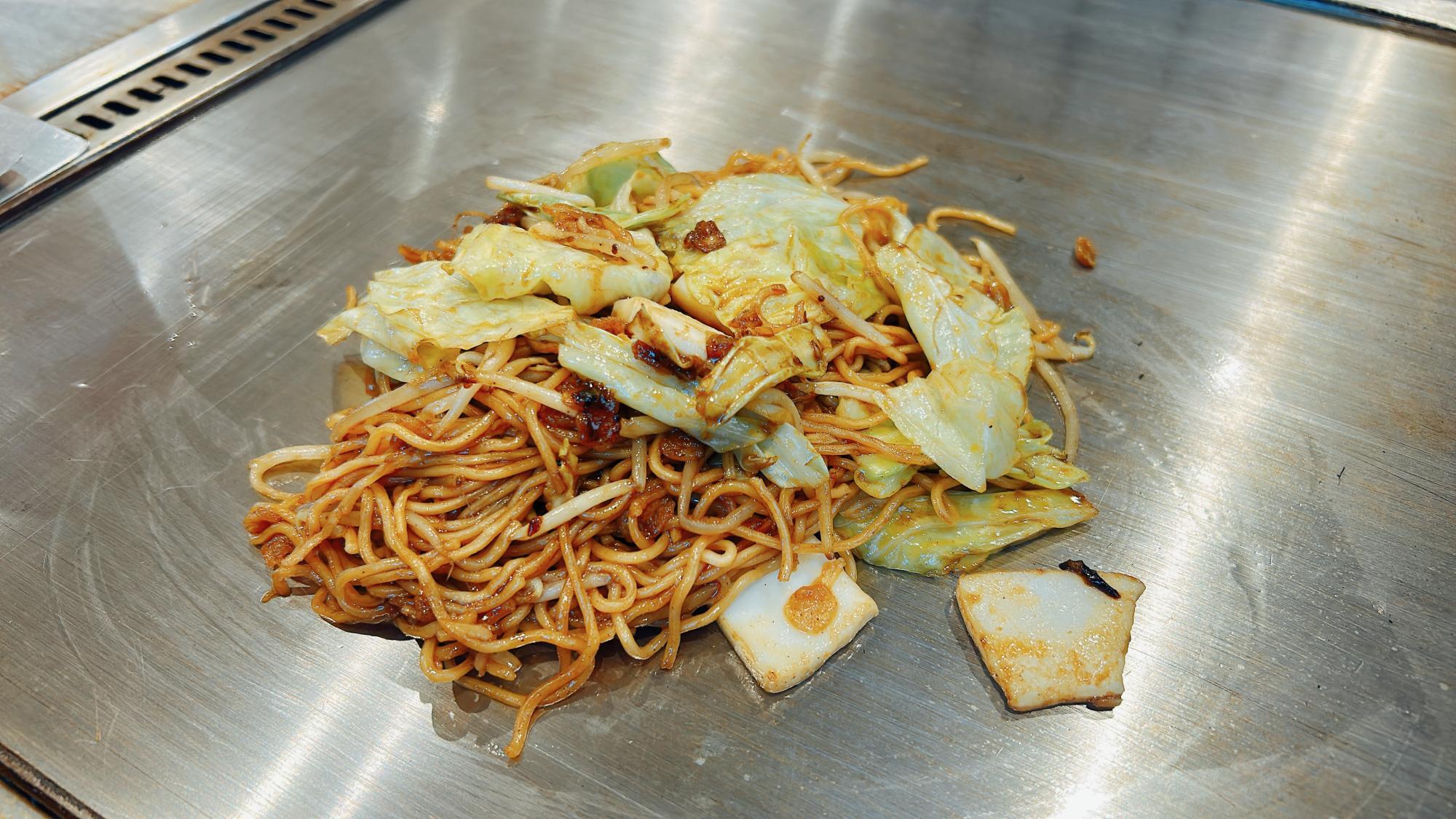 細麺の焼きそばに柔らかなイカがたっぷりと入っています。