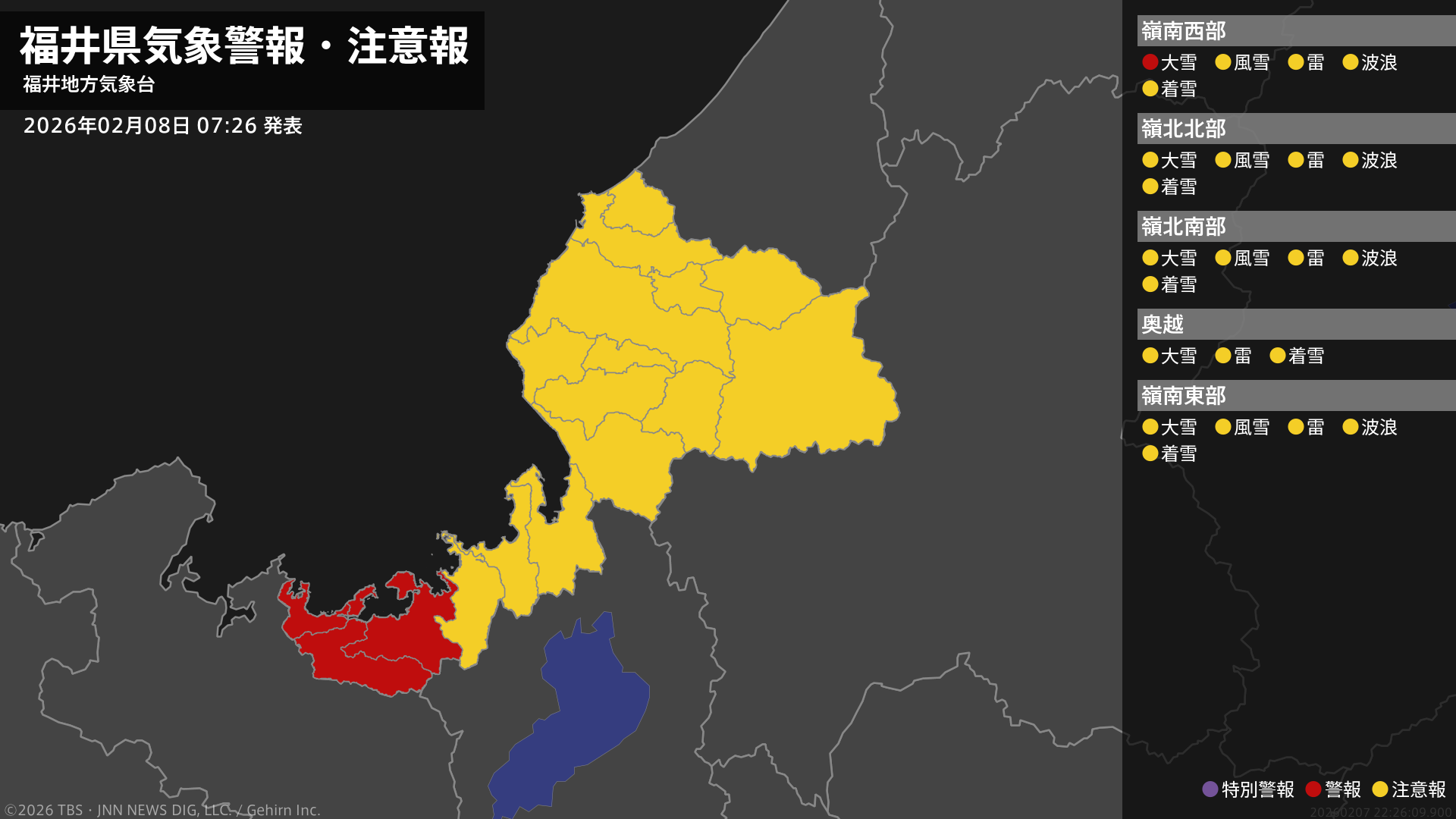 気象台は、午前7時26分に、大雪警報を小浜市、高浜町、おおい町に発表しました。