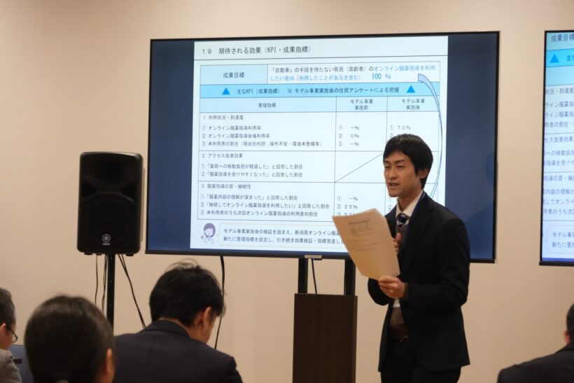 2月6日には、その最終発表会が新潟市中央区内で開催され、「脳血管疾患と心疾患の相関関係の分析を通じた予防施策」や「薬局の偏在から生じる課題への対応」など、各チームが施策案を発表した。