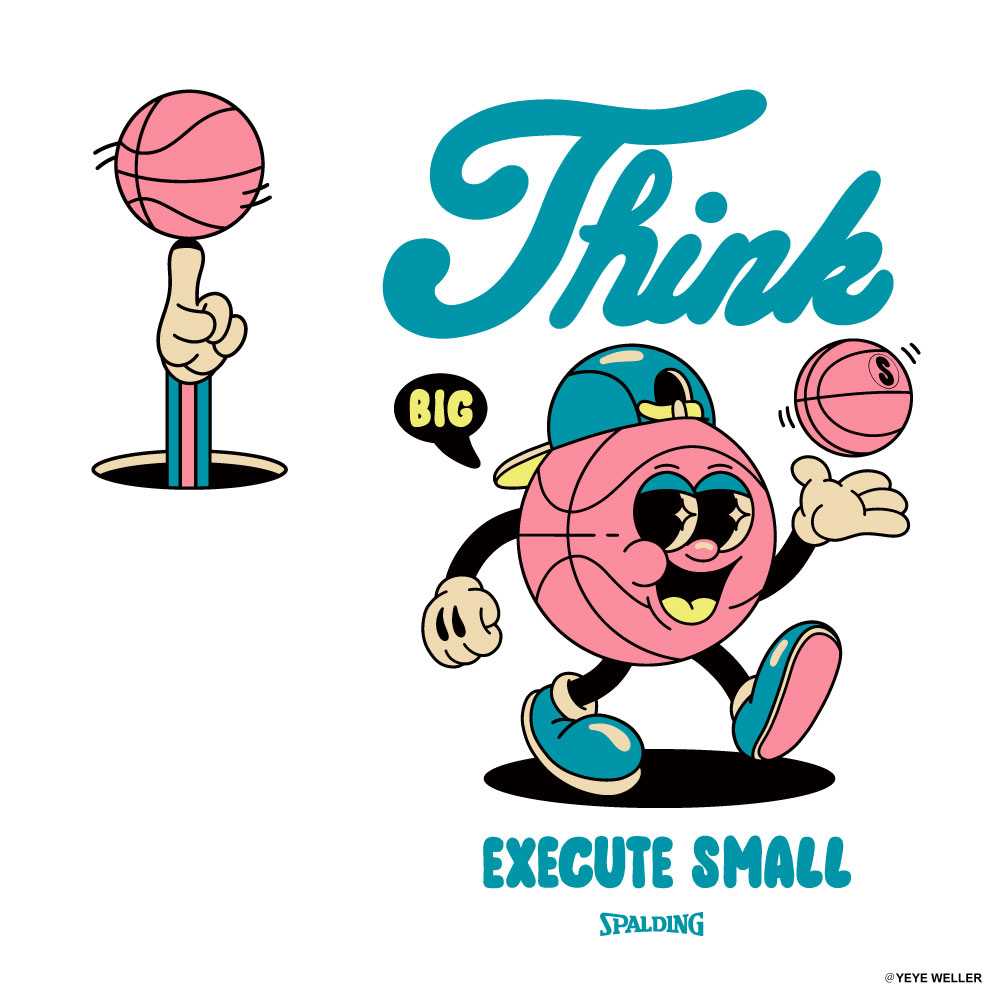 “THINK BIG EXECUTE SMALL”のフレーズとバスケットボールキャラクターのポップでカラフルなバックプリントデザイン