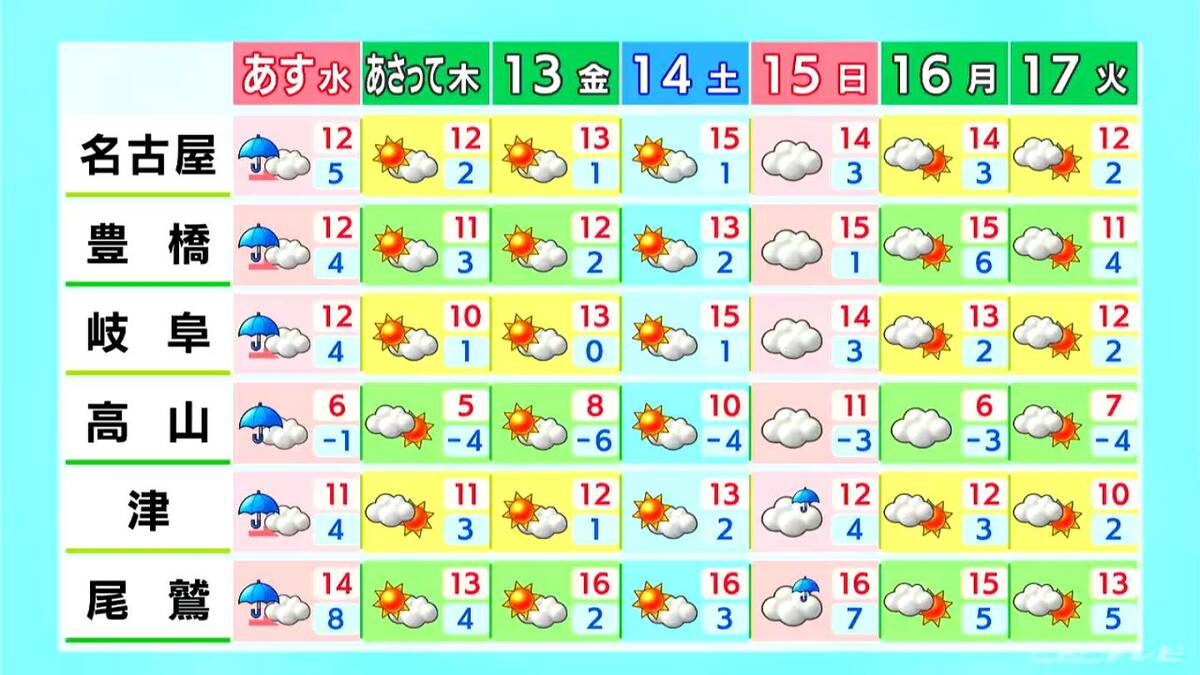 最高気温は名古屋で11℃、豊橋や岐阜で10℃、高山や津では8℃の予想です(高山は観測機器の点検作業の影響で、前日との気温差が表示されていません)。