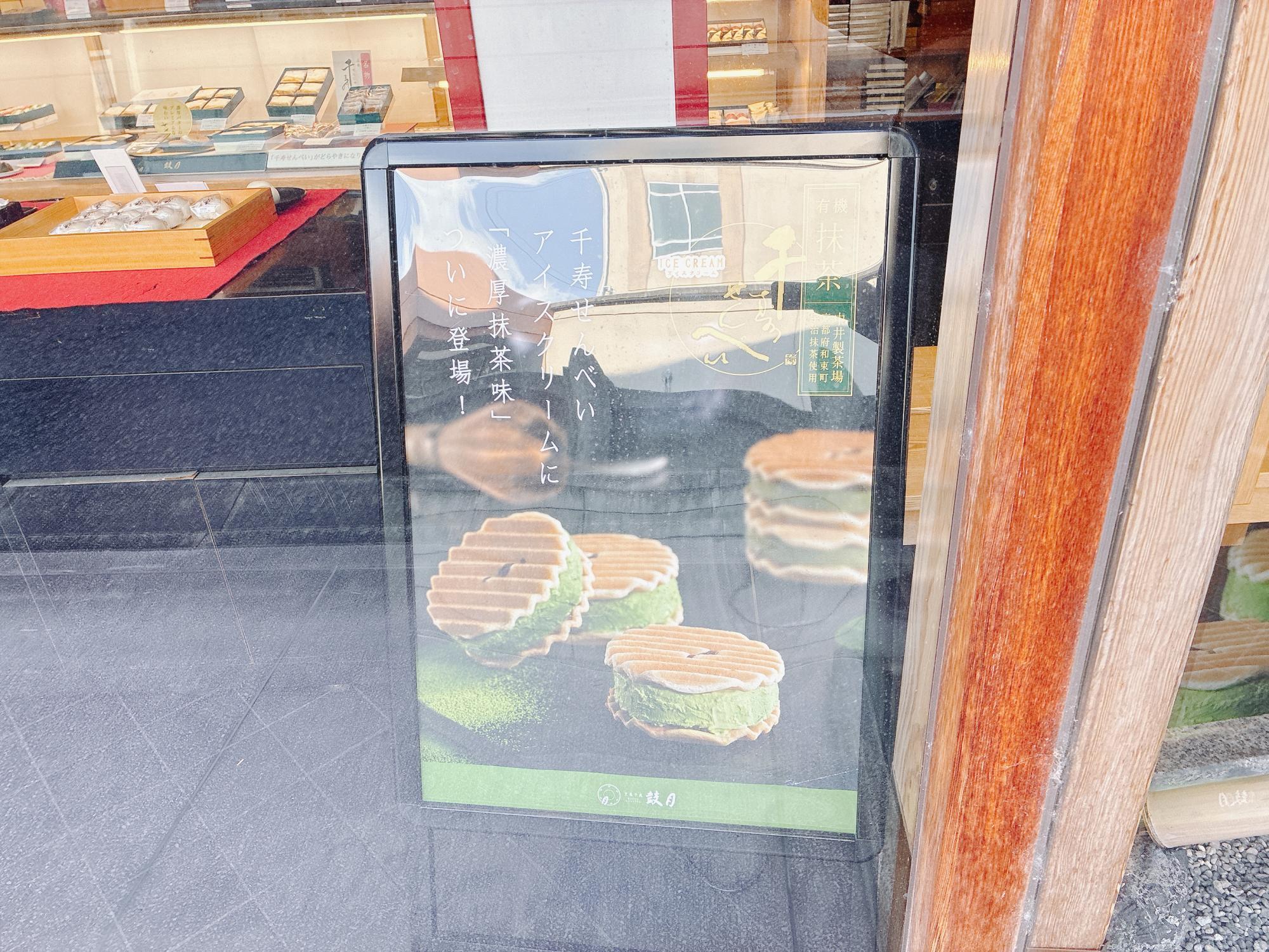 今回のお目当ては、こちらの看板にもある「千寿せんべいアイスクリーム」。あの波型のヴァッフェル生地にアイスクリームをサンドした、夢のようなスイーツです。