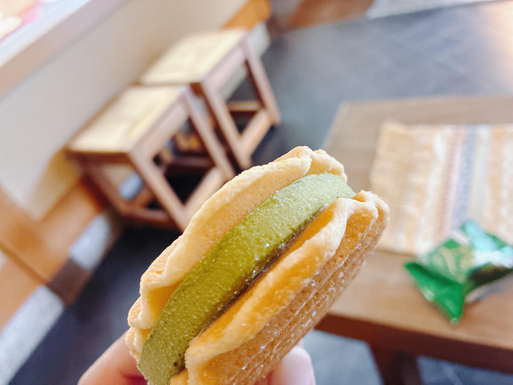 サクサクの生地の間には、京都府和束町産の有機抹茶を使用した濃厚なアイスクリームがたっぷりとサンドされています。見た目のインパクトも抜群ですね。