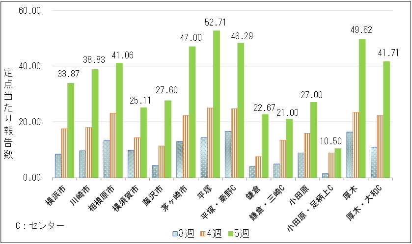 [5]定点当たり報告数の保健所別推移(神奈川県 2026年第3週~2026年第5週)