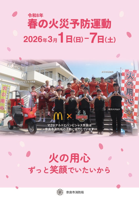 この度、バンビシャス奈良は、昨年の“令和7年 秋の火災予防運動”に引き続き、奈良市消防局様、奈良市マクドナルドフランチャイジー様と、“令和8年 春の火災予防運動(2026年3月1日~7日)”を実施いたします。これにともなった火災予防運動ポスターにも前回と同じく、小林遥太選手、相馬卓弥選手、石井峻平選手、本多純平選手、中谷衿夢選手が起用されました。このポスターは、一部を除く奈良市内の幼稚園、保育園、こども園、小学校、中学校等に掲示されます。ぜひ、皆さんも火災予防にご協力をお願いします!