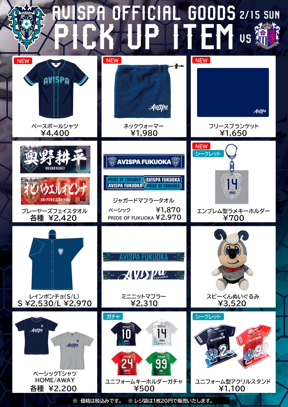 2/15(日)開催C大阪戦のグッズ販売情報をお知らせいたします。今節は、雨対策のレインポンチョや防寒対策グッズ、ベースボールシャツなど新商品を多数そろえております。ぜひ、グッズ売店にてお待ちしております!