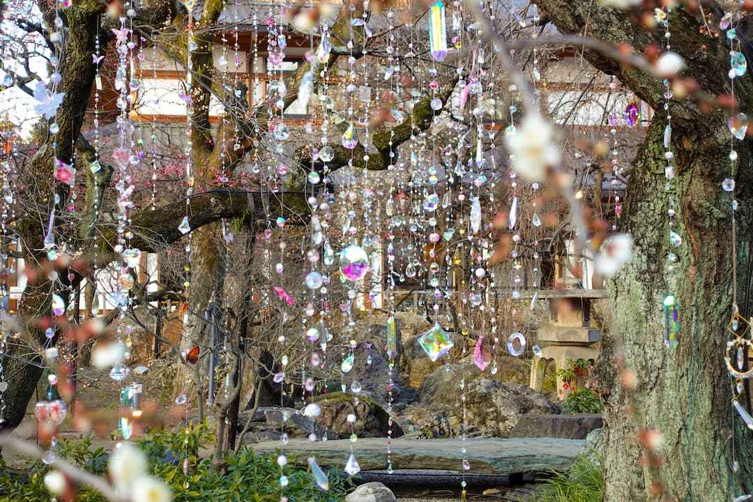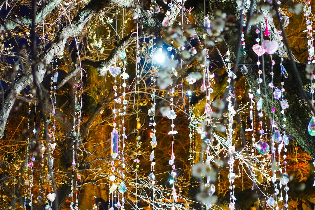 梅苑の木々に吊り下げられた約1,200本のクリスタルは、すべて手作業でつくられ、1本ごとに並び順までデザインされた、蜷川氏の想いが込められた渾身の作品となっています。これまでの作品と同じものは一切使わず、すべて北野天満宮のためにつくられた特別なクリスタルなのだそう。