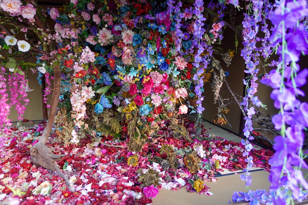 蜷川氏がこれまでも手がけてきたシリーズ《残照》。「今回が最高傑作。北野天満宮という場所の力を借りてやっと完成した」と語るほど、この地での展示に強い想いを寄せています。茶室の内部に咲き誇る花の中には、あえて枯れた状態を再現したものも。咲き誇りながら枯れて落ちていく光景は、いのちがめぐる時間の流れを表現しているのだそう。