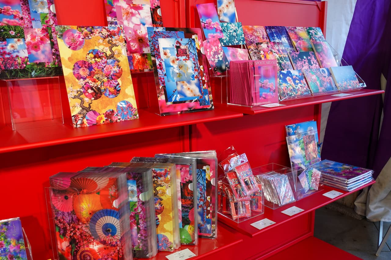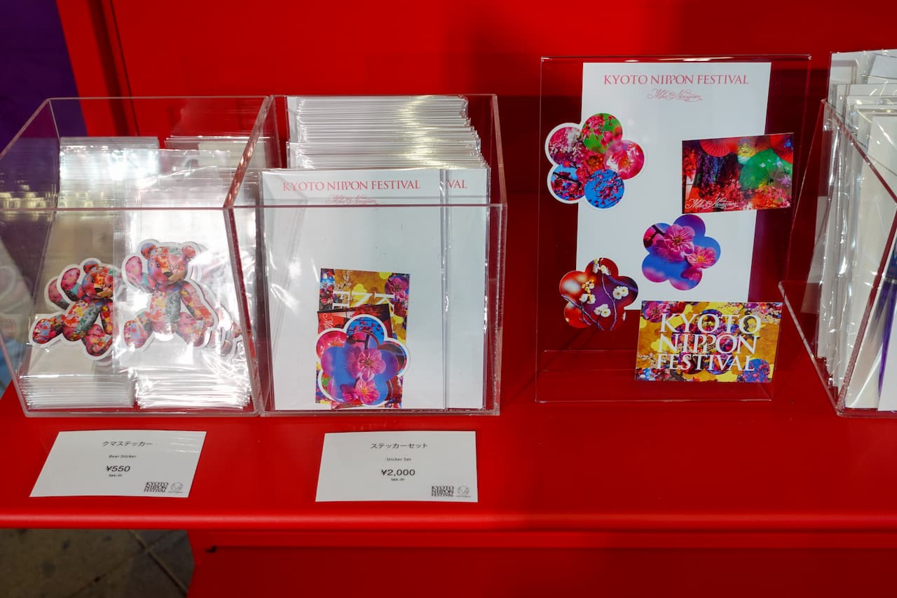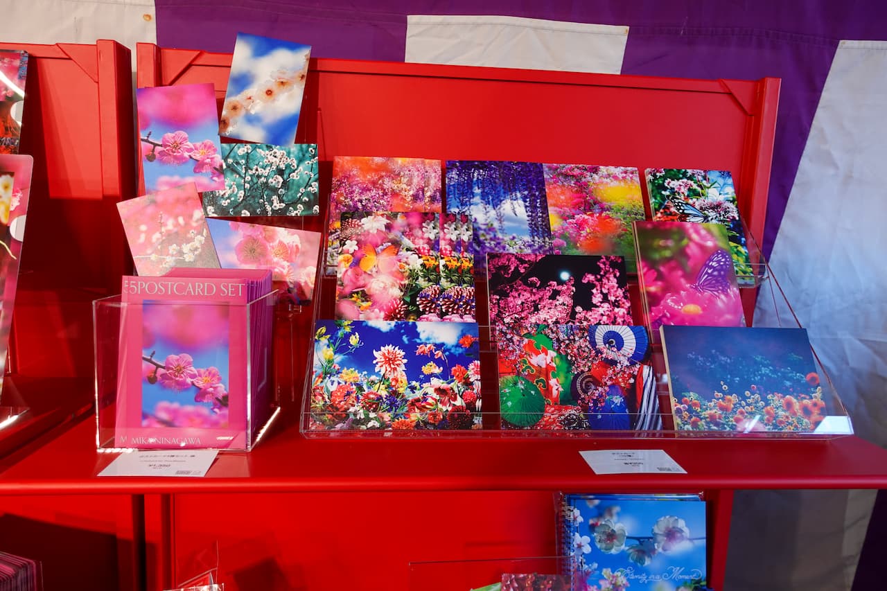 蜷川氏が撮影した北野天満宮の梅の写真をデザインしたTシャツやポストカード、さらに手ぬぐいや生八つ橋など京都のメーカーとコラボした商品まで、蜷川実花作品の世界観を楽しめる多彩なラインナップとなっています。展示で感じた世界観をそのまま持ち帰れるようなアイテムばかりで、訪れた記念にも大切な人への贈り物にもぴったりです。