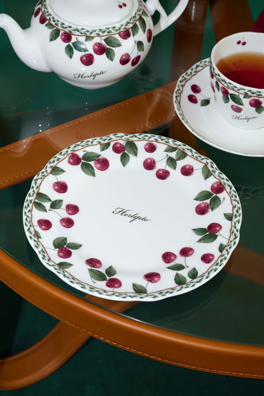 本コレクションでは、プレート・カップ&ソーサー・ティーポットの3種のテーブルウェアを展開。Her lip toのシグネチャーであるチェリーモチーフを、Noritakeの人気シリーズ「オーチャードガーデン」にインスパイアされたボタニカルタッチで描いた、今回だけのオリジナルデザインとなっています。