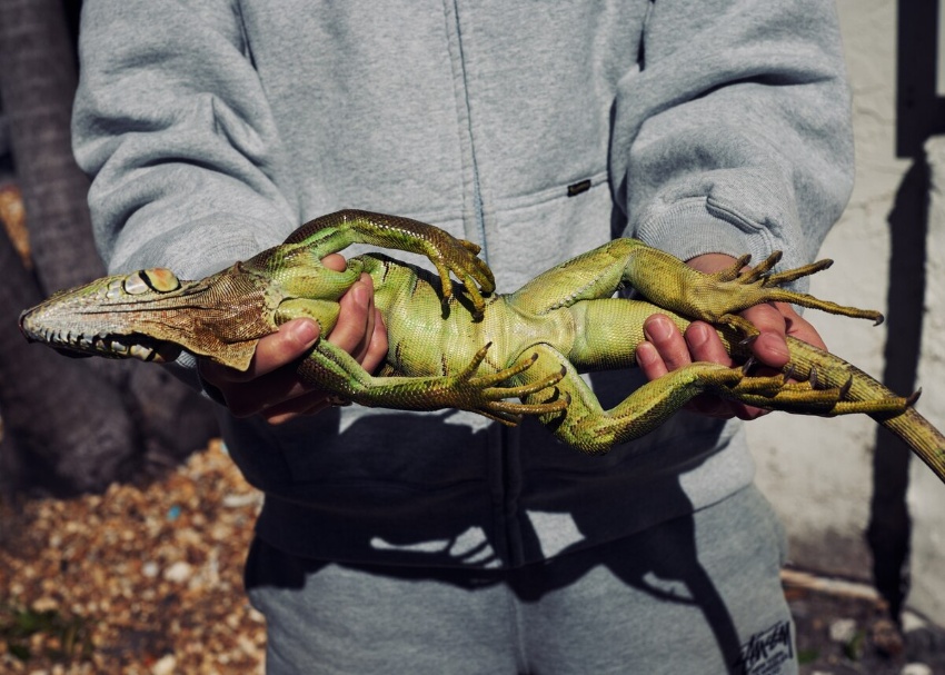 固まったイグアナを仰向けに持つ男性。(Photograph by Alfonso Duran)