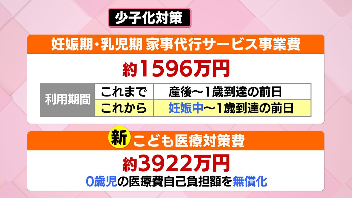 また、新たに0歳児の医療費について自己負担額をゼロとする“無償化”の取り組みに約3900万円を盛り込み、子育て家庭の経済的負担の軽減を図るということです。