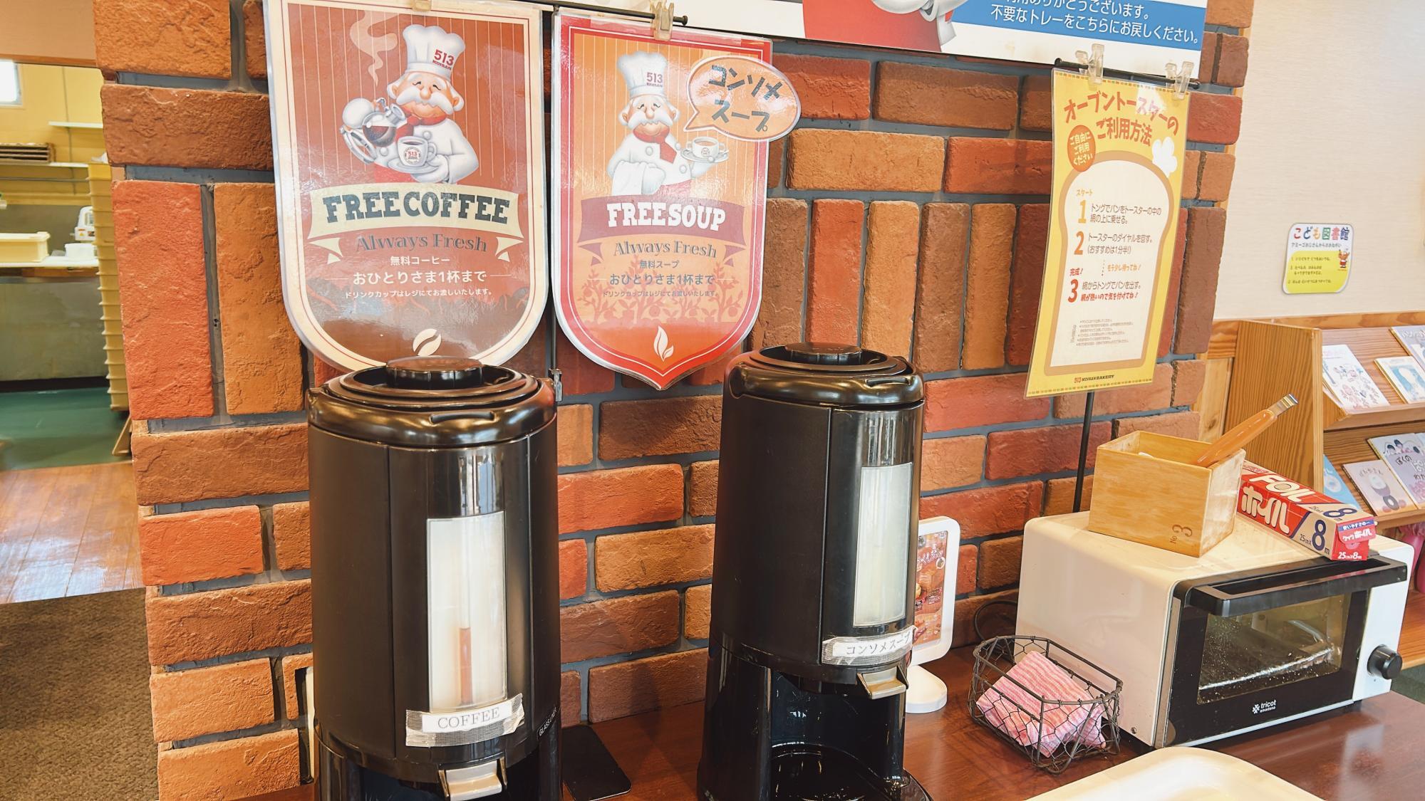 イートイン、テイクアウト共にパンを購入すると、コーヒーまたはスープがサービスでもらえるのもうれしいポイントです。