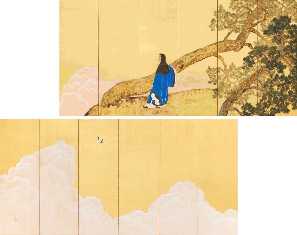 開館記念にふさわしく、縁起の良い鶴に吉祥文様の松が描かれた、豪華な金屏風の横山大観《放鶴》をはじめとする茨城ゆかりの作家たちの華々しい作品の数々を堪能できます。