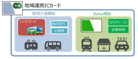 JR東日本が提供する地域連携ICカードは、地方圏の独自ICカードとSuicaのカード・サービスを融合し、1枚のICカードで利用できるようにする2in1カードの仕組み。これにより、全国で相互利用可能な交通系ICカードが地方圏でもシームレスに利用できるようになる。