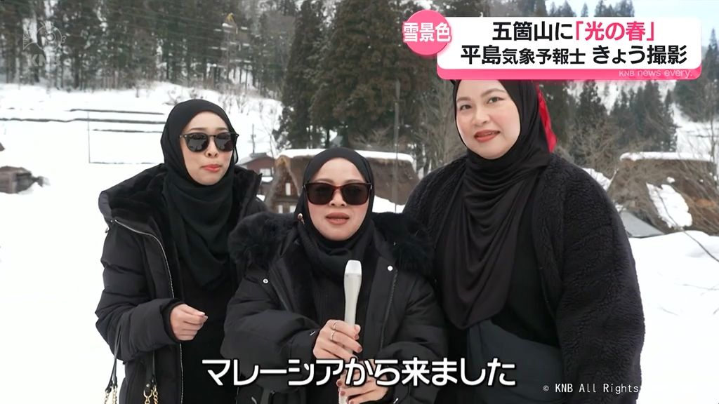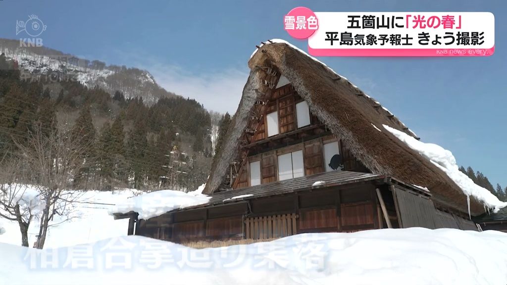 雪をかぶった茅葺き屋根に日差しが当たり、白い水蒸気が青空に解けていく様子は、春の足音を感じさせる印象的な光景でした。五箇山は国の内外から観光客が訪れる人気のスポットで、きょうも写真を撮ったり、ゆっくり散策したりする姿が見られました。