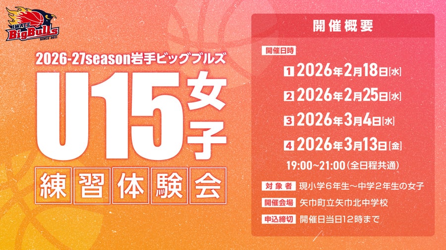 岩手ビッグブルズでは、令和7年度に岩手ビッグブルズU15女子チームを新設いたしました。来年度の活動継続に先立ち、U15女子チームに興味があり、今後の進路を考える上で活動内容を知りたい入団希望者様向けに、練習を実際に体験いただく「練習体験会」を開催いたします。