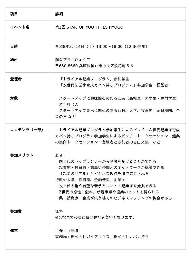 起業支援やスタートアップ投資を行うスタートアップスタジオである株式会社ガイアックス(本社:東京都千代田区、代表執行役社長:上田 祐司、証券コード:3775、以下 ガイアックス)は、兵庫県から受託する「スタートアップ創出促進事業(トライアル起業プログラム)」の一環として、2026年3月14日(土)、兵庫県内の若者を対象とした起業機運醸成イベント「第1回 STARTUP YOUTH FES HYOGO」を開催します。