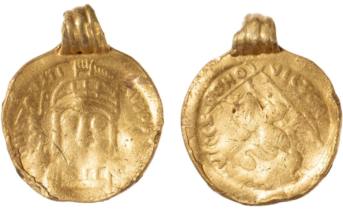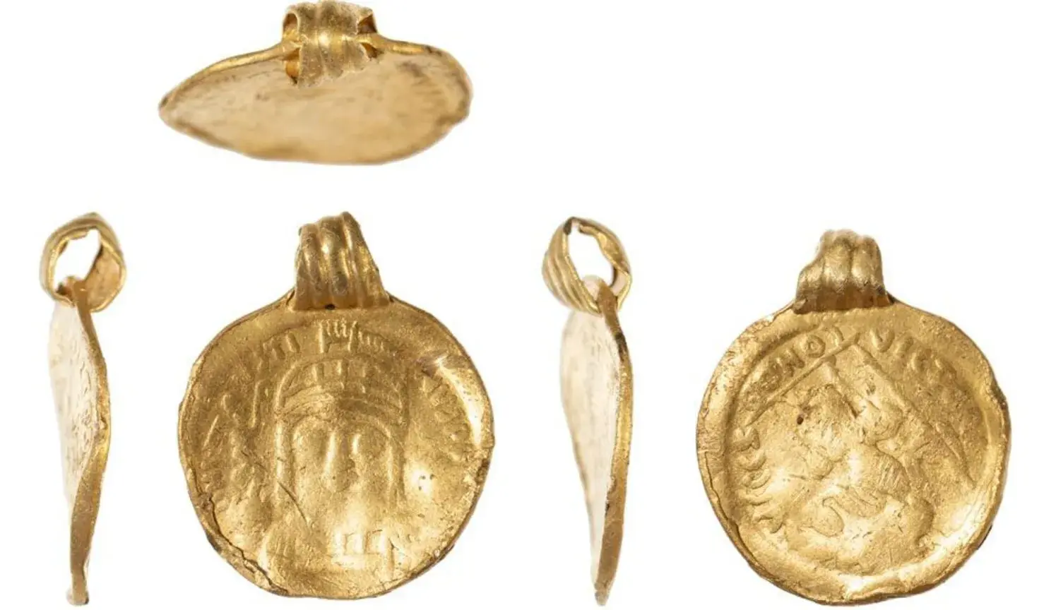 金属探知機愛好家が見つけた、中世初期のものと思われる金貨ペンダント。Photo: Courtesy Colchester and Ipswich Museum Services