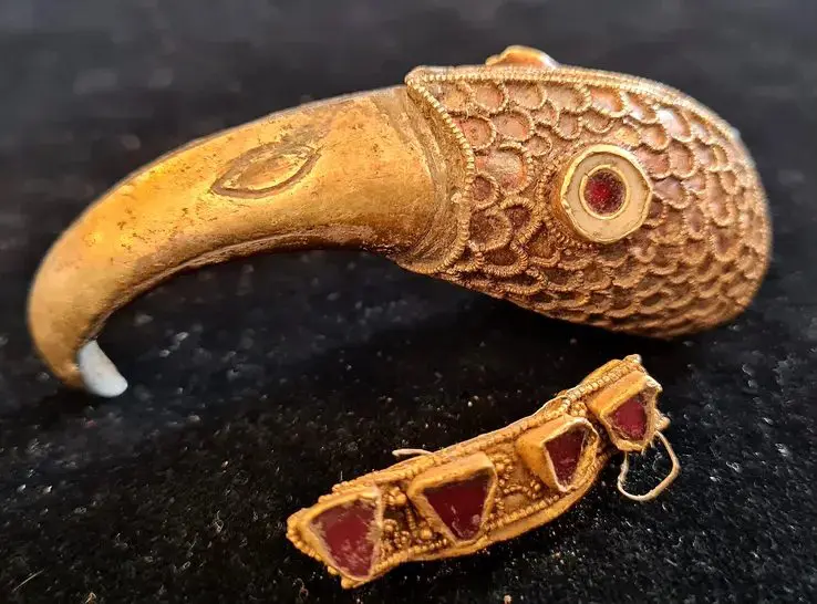 畑から1400年前の純金製カラスの頭部が出土!|金属探知機愛好家グループの新人を含む2人が2025年1月、アングロサクソン時代の金製のカラスの頭部とガーネットが埋め込まれた帯を発掘した。神話では使徒や身の前触れとして登場していたカラスだが、今回見つかった頭部が何を表現しているかはわかっていない【続きを読む】Photo: Chris Phillips