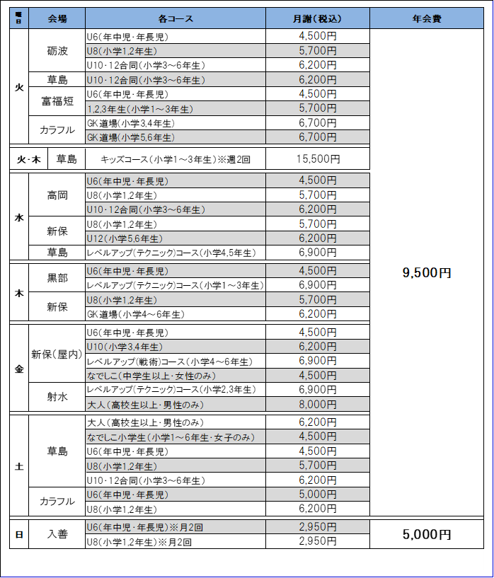 ※コース変更・追加(Wスクール)に際して、追加で年会費は発生いたしません。⇒但し、入善会場に入会後にその他のコースに入会された場合は、追加で年会費4,500円が発生いたします。(2026年4月~2026年10月の期間のみ)