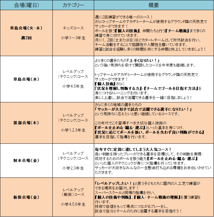 サッカーや様々な運動を行うことにより、コーディネーション能力(身体の調整力)の基礎づくりを目指す。また、基本スキル(ドリブル・パス・コントロール・シュートなど)の習得を目指しながら、サッカーの上達を楽しみ、サッカーが大好きになる。