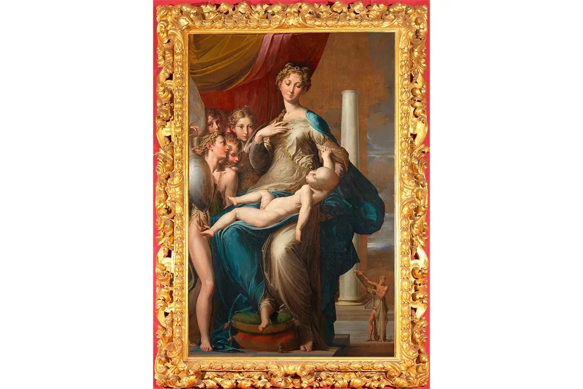 聖母の長い首と指、そして乳首とへそが見える薄布の衣服が描かれたこの絵には、典型的な聖母子像にはない官能性がある。【作品の詳細はこちら】