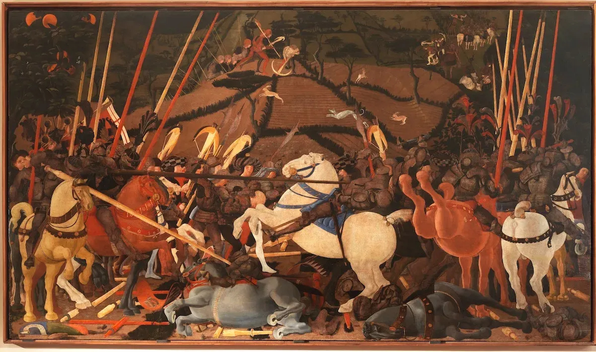 3. パオロ・ウッチェッロ《サン・ロマーノの戦い:ニッコロ・マウルジ・ダ・トレンティーノは、ベルナルディーノ・デラ・カルダを倒した》(1435-40年頃)Photo: Uffizi Gallery