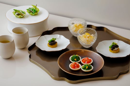 空豆の香りが広がるチュロスには、レモンコンフィの爽やかな酸味とキャビアのほどよい塩味、シェーブルチーズの奥行きあるコクが重なり、春らしい軽やかさの中に豊かな表情を添えています。ホワイトアスパラガスと新玉ねぎのムースは、トマトコンソメジュレの澄んだ旨みと日向夏のやわらかな酸味、アーモンドの食感が織りなす、繊細で上品な味わいが魅力です。春の息吹を感じるセイボリーに寄り添うのは、冷たい玉露。 キリッと冷やした玉露ならではの豊かな旨みとほのかな甘みが、それぞれの一皿と調和し、味わいに余韻を残します。