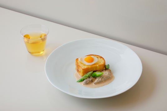 香ばしく焼き上げたブリオッシュに、燻製ハムとチーズのほどよい塩味、アスパラガスの瑞々しさが寄り添い、さらに鶉卵の目玉焼きとベシャメルソースをサンド。深い味わいながらも軽い口当たりに仕立てたモリーユ茸のクリームソースが重なり合うことで、まろやかな味わいと奥行きあるコクが広がる一皿に仕上がりました。合わせるのは、漢方とジャスミン茶をブレンドした一杯。 清らかな香りが後味をすっと整え、リッチな旨みを軽やかにまとめ上げ、思わずもう一口と手が伸びる余韻を生み出します。