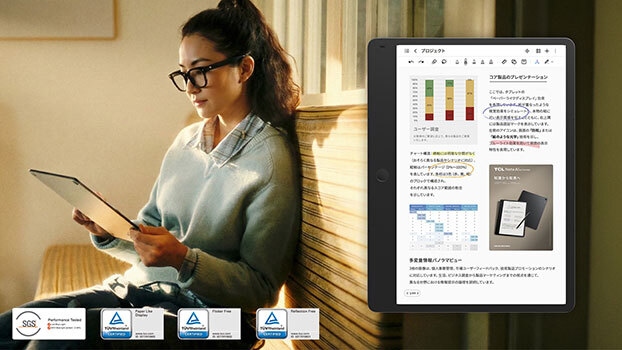 本体には、10点マルチタッチに対応した、11.5インチのNXTPAPER Pureディスプレー(解像度2200×1440)を搭載する。120Hzのリフレッシュレートと約1670万色表示に対応しており、3A(アンチグレア/反射防止/指紋防止)クリスタルシールドガラスによって反射やグレアを抑えられる。TUV認証にも対応し、快適な閲覧・筆記環境を実現している。