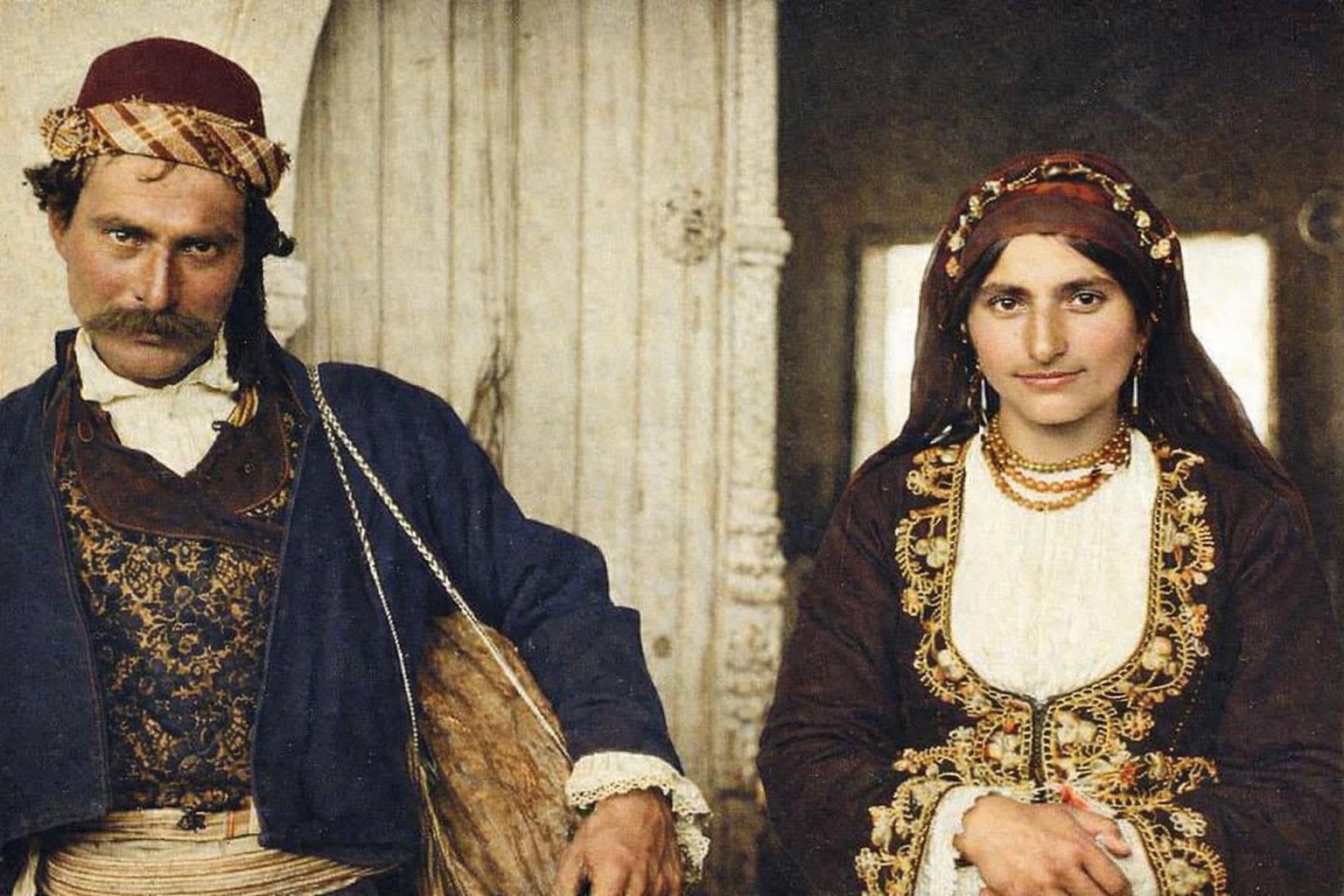 アギオス・ヘラクレイディスの祭りでお祭り衣装を着た農民たちの両性具有。 1895年。男性はブルカを肩に担ぎ、頭にはギリシャ風のフェズをかぶっていることに注目してください。これは低くてしわがあり、大きなタッセルが付いていますが、オスマン様式は直立し、高く、小さなタッセルが付いています。当時、キプロス人男性は両方のタイプのフェズを着ていました。 1878年にイギリス人がキプロスに到着すると、彼らはすぐにそれらを廃止しました。キプロスの学習ノート。マックス・オーネファルシュ=リヒター。右が元の写真、左と上が人工知能を搭載したカラー写真です。