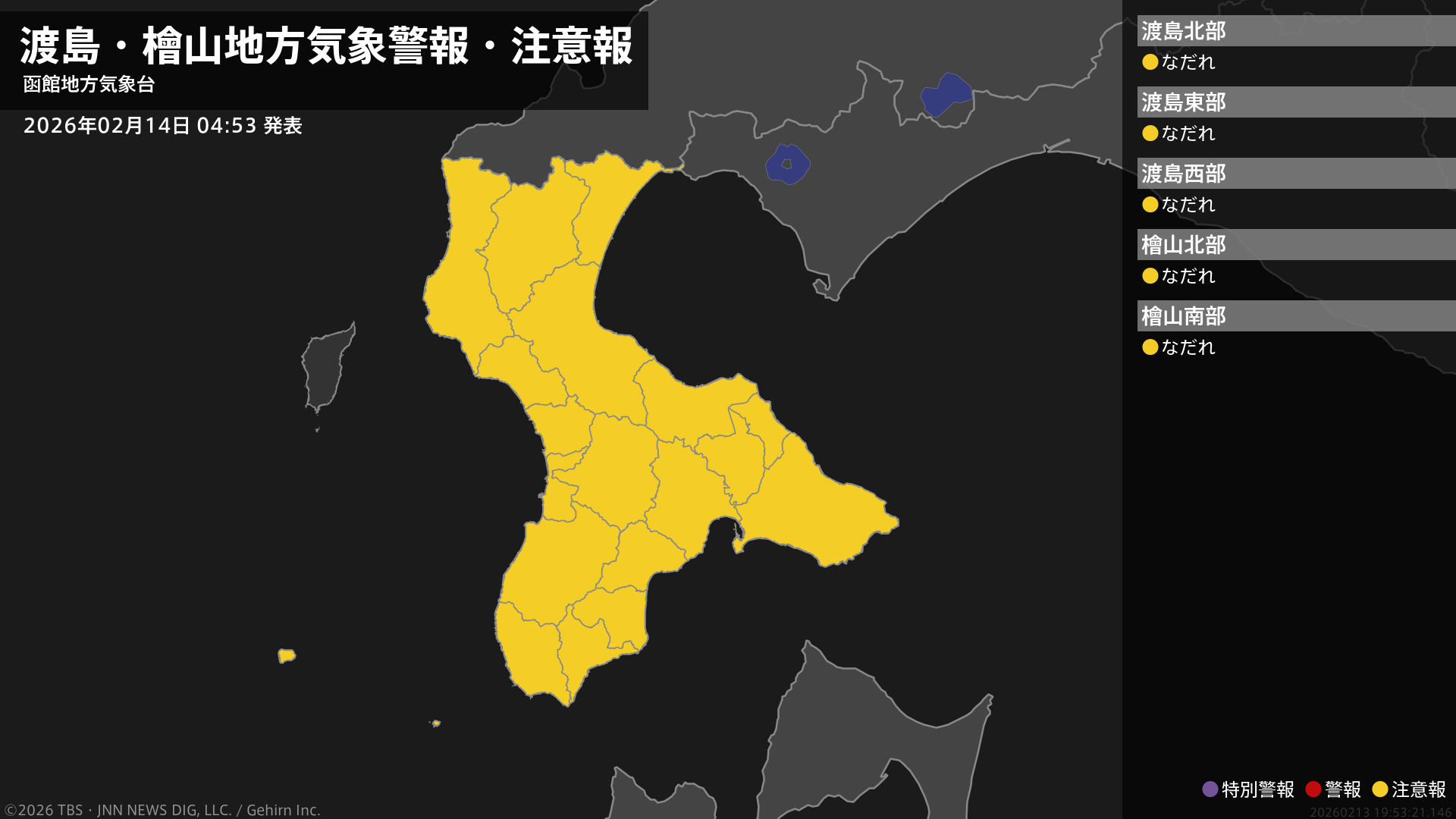 【なだれ注意報】北海道・函館市、北斗市、松前町、福島町、知内町、木古内町などに発表(雪崩注意報) 14日04:53時点
