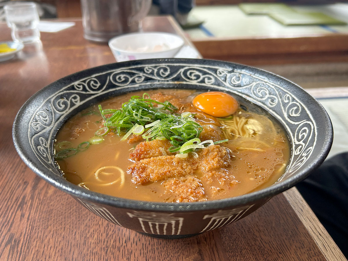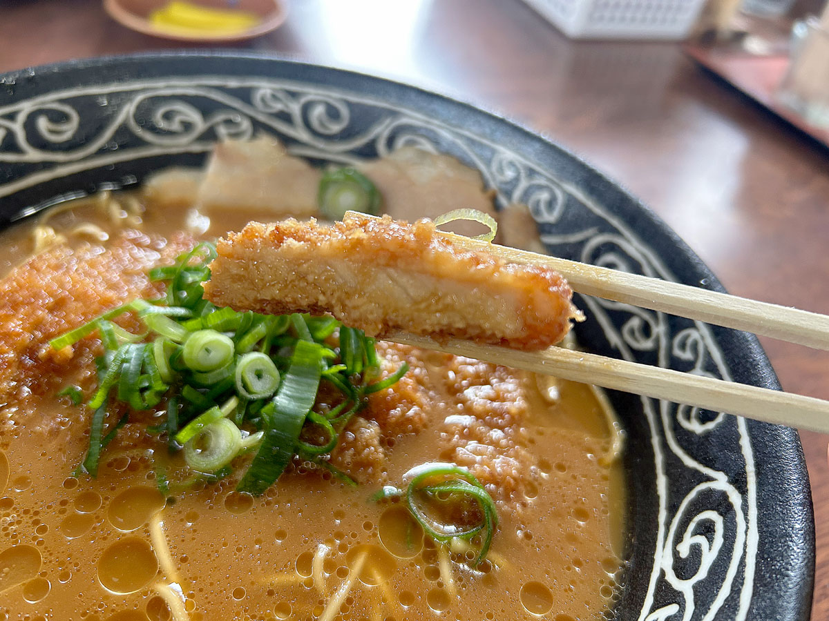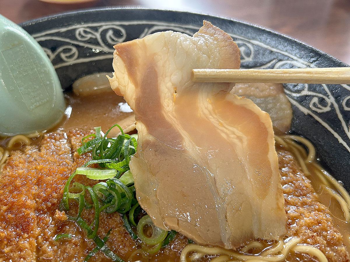 チャーシューは薄切りで脂身が多く、食べやすい。スープの染みたトンカツを食べるために、麺もチャーシューも少し軽めに設計されているかのように思えてくる。スープの塩味は強くなく、スープをついつい飲んでしまう。