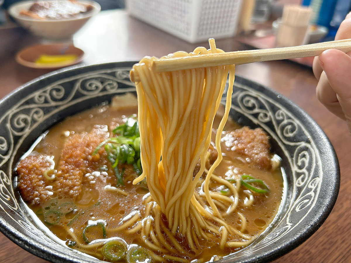 トンカツは衣を厚くせず、肉と一体化している。スープにしっかり沈んでいても、衣が?がれるない。丼に端から端まで並ぶように1枚半のトンカツがのっている。麺は中細麺でスープがよく絡む。麺は比較的、すっとすすれるくらいが軽くてちょうどいい。麺の大盛りは「大(半玉)」(150円)、「大大(1玉)」(350円)、「大大大(1玉半)」(550円)と増やすこともできる。