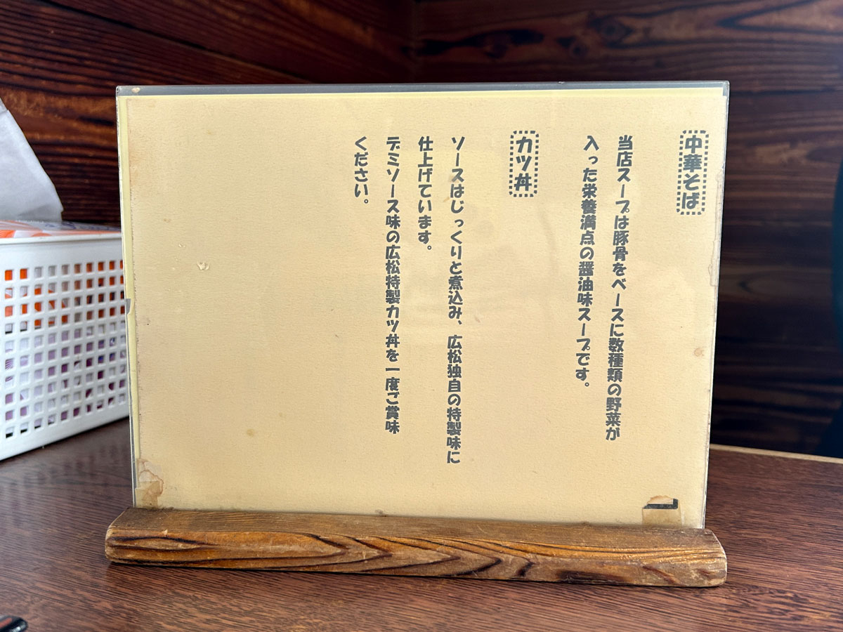 同店の定番とされるのは、「中華そばとカツ丼(小)セット」(1,450円)。客が注文時に「名物」とスタッフに伝えるほど、よく親しまれている定番メニューの一つ。カツ丼は、卵とじではなく、デミグラスソース。初代店主が洋食店出身だったことから、デミグラスソースのカツ丼を提供したとか。