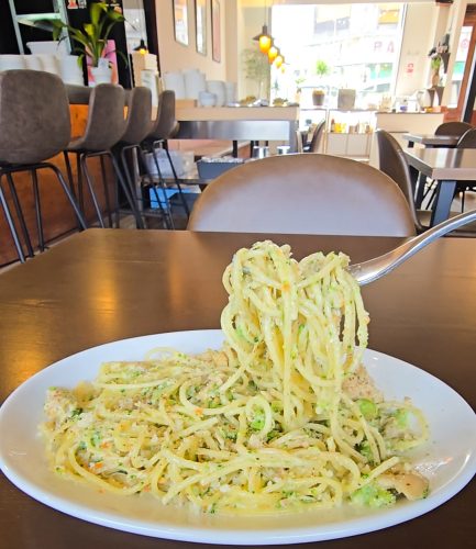 アクセントなるシナモンの香りがふわっと立ち上がり、濃厚なクリームソースがパスタにしっかり絡みます。